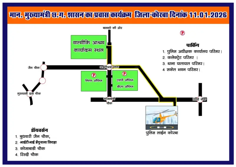 मुख्यमंत्री के प्रवास और सुरक्षा व्यवस्था को ध्यान में रखते हुए यातायात पुलिस द्वारा रूट डायवर्जन लागू किया गया है। इस संबंध में यातायात पुलिस ने वैकल्पिक मार्गों का चार्ट जारी किया है, ताकि आमजन को आवागमन में असुविधा न हो। मुख्यमंत्री के काफिले के गुजरने के दौरान संबंधित मार्गों पर अस्थायी रूप से यातायात नियंत्रित रहेगा और जरूरत अनुसार वाहनों को वैकल्पिक रास्तों से डायवर्ट किया जाएगा। प्रशासन ने आम नागरिकों से अपील की है कि वे जारी किए गए ट्रैफिक चार्ट का पालन करें और अनावश्यक परेशानी से बचने के लिए निर्धारित वैकल्पिक मार्गों का उपयोग करें। मुख्यमंत्री के इस दौरे को लेकर जिले में प्रशासनिक और सुरक्षा स्तर पर सतर्कता बढ़ा दी गई है।