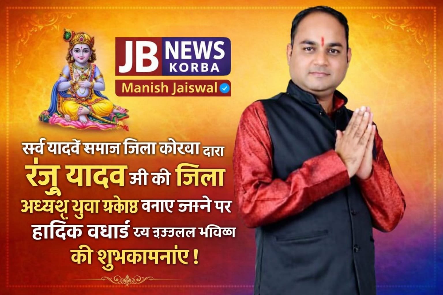 इसी कड़ी में सर्व यादव समाज जिला कोरबा के अंतर्गत युवा प्रकोष्ठ के जिला अध्यक्ष के रूप में रंजू यादव जी को नियुक्त किए जाने पर समाज में खुशी का माहौल है। समाज के पदाधिकारियों एवं सदस्यों ने उन्हें हार्दिक बधाई एवं शुभकामनाएं दी हैं।