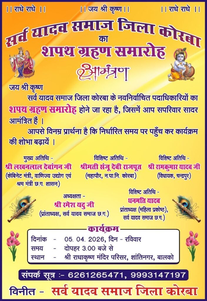 कोरबा। सर्व यादव समाज जिला कोरबा द्वारा नव निर्वाचित पदाधिकारियों का शपथ ग्रहण समारोह आगामी 05 अप्रैल 2026, रविवार को आयोजित किया जाएगा। यह कार्यक्रम दोपहर 3:00 बजे से श्री राधाकृष्ण मंदिर परिसर, शांतिकनगर, बालको में संपन्न होगा, जिसमें समाज के लोगों को सपरिवार आमंत्रित किया गया है।