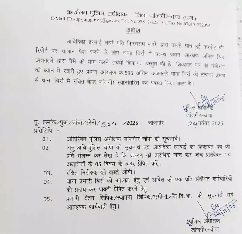 जांजगीर। जिले में पुलिस विभाग की छवि को धूमिल करने वाले एक मामले में कठोर कार्रवाई की गई है। थाना बिर्रा में पदस्थ प्रधान आरक्षक अनिल सिंह अजगल्ले को एक पीड़ित महिला से रिश्वत मांगने के आरोप में तत्काल प्रभाव से निलंबित कर दिया गया है। शिकायत सीधे जांजगीर SP के पास पहुंची, जिसके बाद बिना देरी किए हवलदार को लाइन अटैच कर दिया गया।