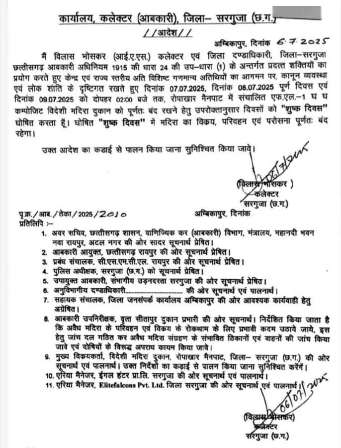 अम्बिकापुर। सरगुजा जिले के मैनपाट में 7 जुलाई और 8 को सभी शराब दुकानों को बंद रखने का आदेश जारी किया गया है। यह निर्णय भाजपा के तीन दिवसीय प्रशिक्षण शिविर को ध्यान में रखते हुए लिया गया है।