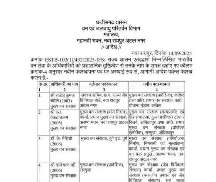 फेरबदल की सूची में प्रदेश के कई प्रमुख जिले जैसे रायपुर, दुर्ग, बिलासपुर, सरगुजा और बस्तर के अधिकारी शामिल हैं।