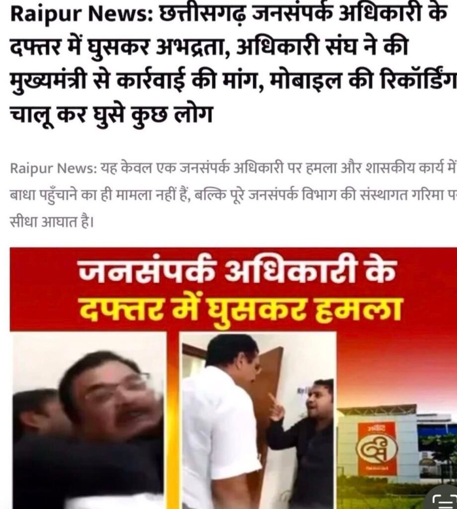 मैं उक्त वीडियो की पुष्टि नहीं करता परंतु दर्ज एफ़आईआर में छत्तीसगढ़ जनसंपर्क संचनालय के विभागीय अपर संचालक संजीव तिवारी ने जो आवेदन दिया है, उसमें उन्होंने स्वयं लिखा है… “मैं अपने सीट से उठकर उन्हें कक्ष से बाहर निकालने की कोशिश की… FIR में दर्ज यह बयान वीडियो से हूबहू मेल खाता है। पूरे एफ़आईआर को पढ़िए- यह स्वयं इस वीडियो की पुष्टि कर दे रही है! अब ये वीडियो सही है या संजीव तिवारी ये आप तय कीजिए ?