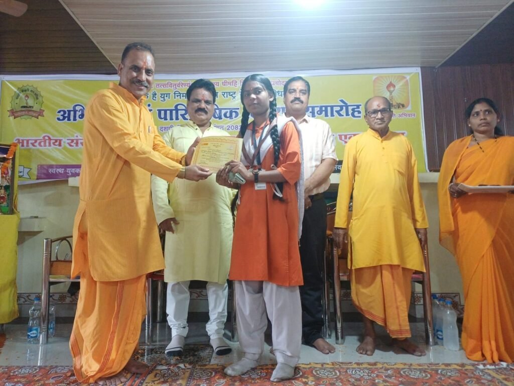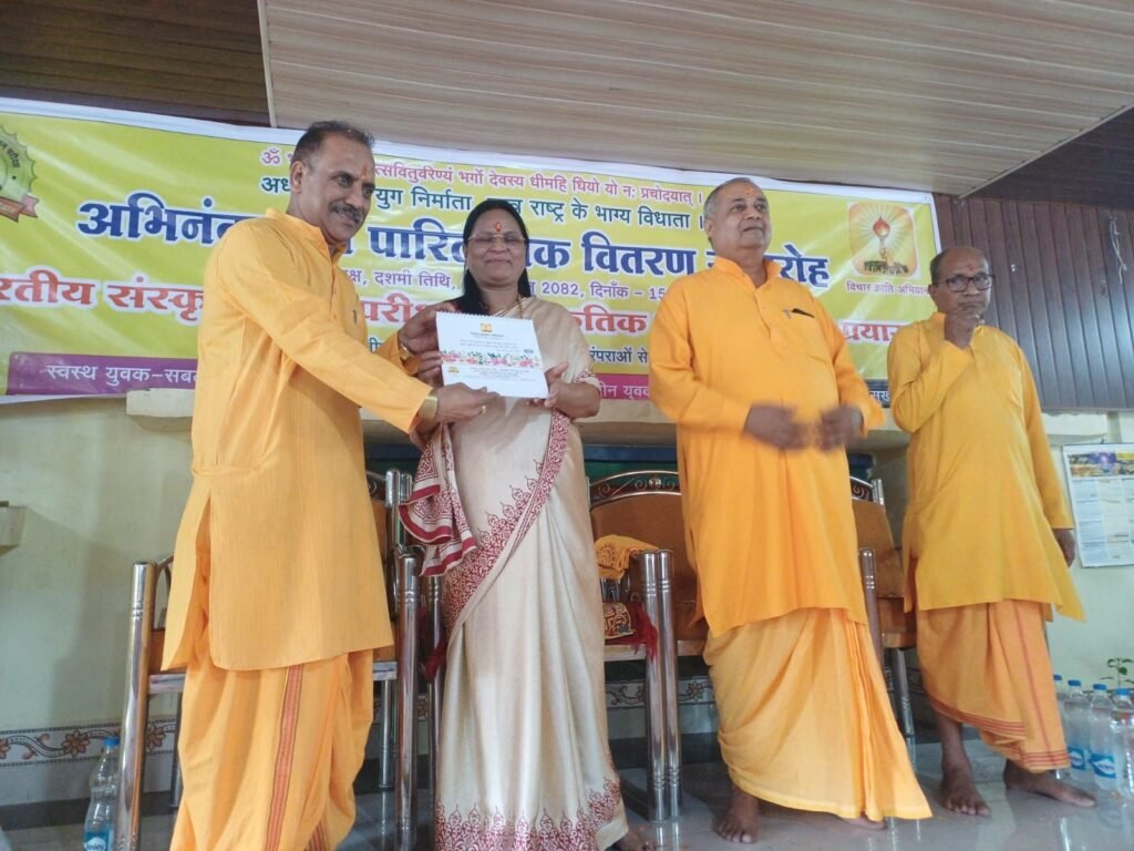 कोरबा। अखिल विश्व गायत्री परिवार शांतिकुंज हरिद्वार के सूक्ष्म संरक्षण एवं मार्गदर्शन मे देश विदेश में संचालित भारतीय संस्कृति ज्ञान परीक्षा 2025-26 में कोरबा जिला में उच्च स्थान पाने वाले छात्र / छात्राओं को मान. महापौर श्रीमती संजू देवी राजपूत, नगर निगम कोरबा के मुख्य आतिथ्य एवं श्री तामेश्वर उपाध्याय, जिला शिक्षा अधिकारी तथा श्री राजेन्द्र पाण्डेय,पूर्व जिलाध्यक्ष भाजपा, जिला कोरबा के विशिष्ट आतिथ्य में गायत्री शक्ति पीठ कोरबा में प्रातः 10.30 बजे सम्मानित किया गया।