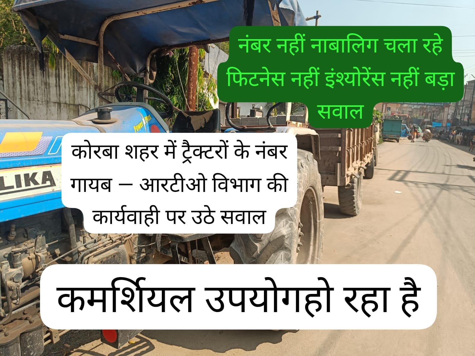 स्थानीय स्तर पर देखा गया कि कई ट्रैक्टर बिना नंबर प्लेट के शहर में कमर्शियल उपयोग में लाए जा रहे हैं। यह न केवल परिवहन नियमों का उल्लंघन है, बल्कि सुरक्षा और कानूनी दृष्टि से भी गंभीर मामला है।