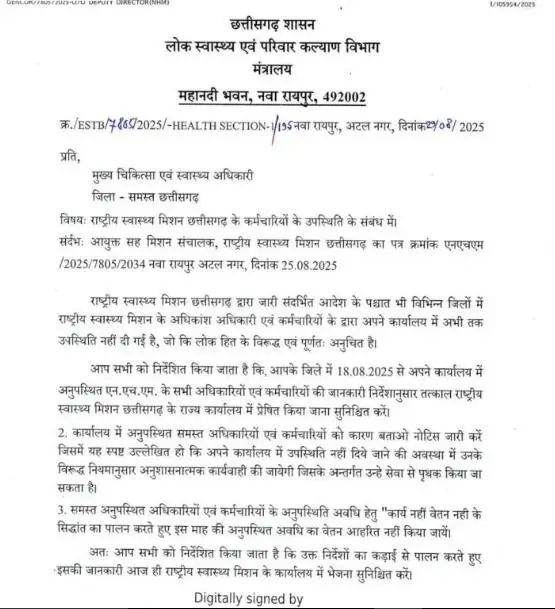 रायपुर। छत्तीसगढ़ में राष्ट्रीय स्वास्थ्य मिशन (NHM) के 16,000 से अधिक कर्मचारियों की अनिश्चितकालीन हड़ताल को लेकर लोक स्वास्थ्य एवं परिवार कल्याण विभाग ने सख्त रुख अपनाया है। विभाग ने सभी जिलों के मुख्य चिकित्सा एवं स्वास्थ्य अधिकारियों (सीएमएचओ) को आदेश जारी कर कहा है कि यदि कर्मचारी तत्काल काम पर नहीं लौटते, तो उनकी सेवा समाप्ति की कार्रवाई की जाएगी। साथ ही, अनुपस्थित कर्मचारियों का इस माह का वेतन “काम नहीं, वेतन नहीं” के सिद्धांत पर रोकने के निर्देश दिए गए हैं।