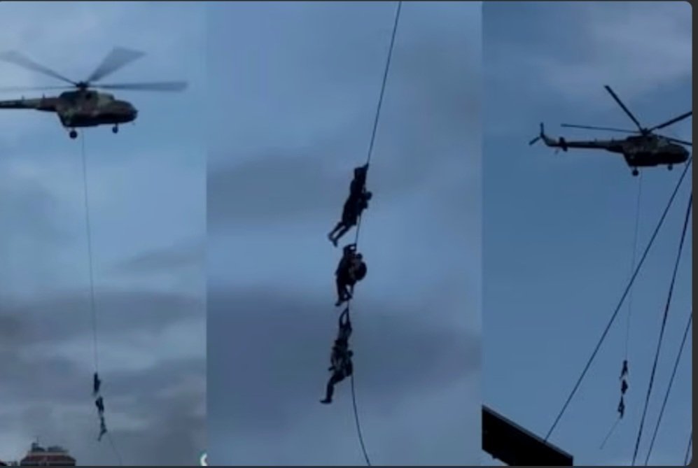 वीडियो में एक ऐसा दृश्य भी सामने आया जिसमे तीन नेता हेलीकॉप्टर की रस्सी पकड़ कर हवा में लटक कर सुरक्षित स्थान में जल्द से जल्द पहुंचना चाहते हैं।