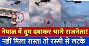 नेपाल में जारी विरोध प्रदर्शनों के बीच एक ऐसा वीडियो सामने आया है जो काफी हैरान करने वाला है। इस वीडियो में एक हेलीकॉप्टर में कुछ लोगों को लटके हुए देखा जा सकता है जिन्हें प्रदर्शनकारियों से दूर किसी सुरक्षित जगह पर ले जाया गया है। यह वीडियो ऐसे समय में सामने आया है जब देश में सरकार विरोधी प्रदर्शन जारी हैं और रुकने का नाम नहीं ले रहे हैं। मंगलवार को प्रदर्शनकारियों ने देश के 3 पूर्व पीएम से लेकर वित्त मंत्री और सुप्रीम कोर्ट से लेकर संसद तक को निशाना बनाया है।