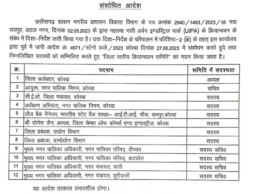 छत्तीसगढ़ शासन नगरीय प्रशासन विकास विभाग द्वारा महात्मा गांधी अर्बन इण्डस्ट्रिल पार्क (UIPA) के क्रियान्वयन के संबंध में दिशा-निर्देश जारी किया गया है। उक्त दिशा-निर्देश के परिपालन में परिशिष्ट-2 (iii) के तहत् द्वारा पूर्व में जारी आदेश दिनांक 27.06.2023 में संशोधन करते हुये सदस्यों को सम्मिलित कर जिला स्तरीय क्रियान्वयन समिति का गठन किया है।